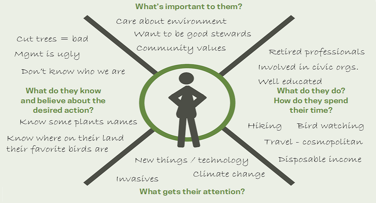Only the last question directly pertains to forestry or conservation in particular; the first three are about landowners’ regular lives. Knowing people’s general values, circumstances, lifestyles, and interests may seem irrelevant at first, but this information is crucially important for developing effective programs and messages. For example: